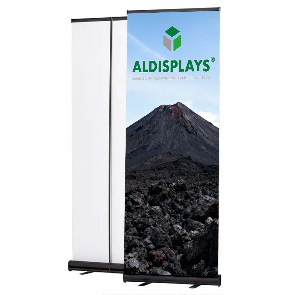 Bannerdisplay RollUp - BASIC - schwarz - Sichtformat: 850 x 2.000mm - bestehend aus System, Aluminiumstange, - gepolsterter Transporttasche mit Tragegurt, - inkl. Digitaldruckbanner 850 x 2.160 mm (Poly) - Druck gem. gel. Druckdaten - einzeln verpackt