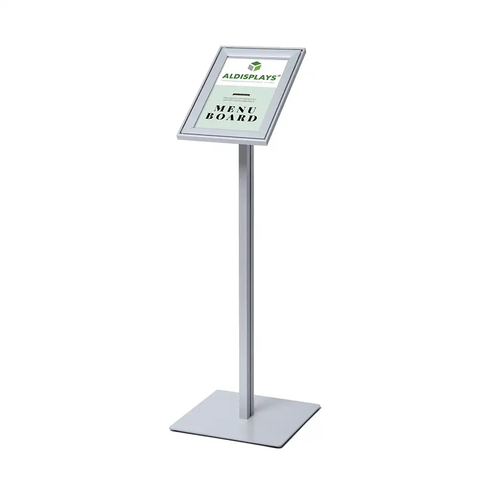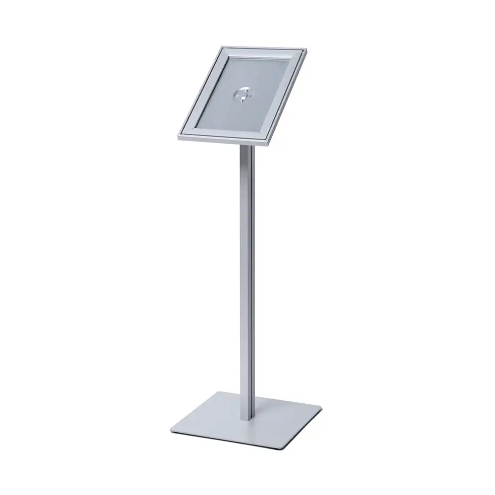 Infoständer mit Klapprahmen Premium - im Format DIN A4 (hoch oder quer) - Klapprahmen im 37er Profil Gehrung - Farbe: silber-eloxiert (EV1) - Einlegeformat 297x210 mm - Stabile Aluminium-Konstruktion, Fuß Metall