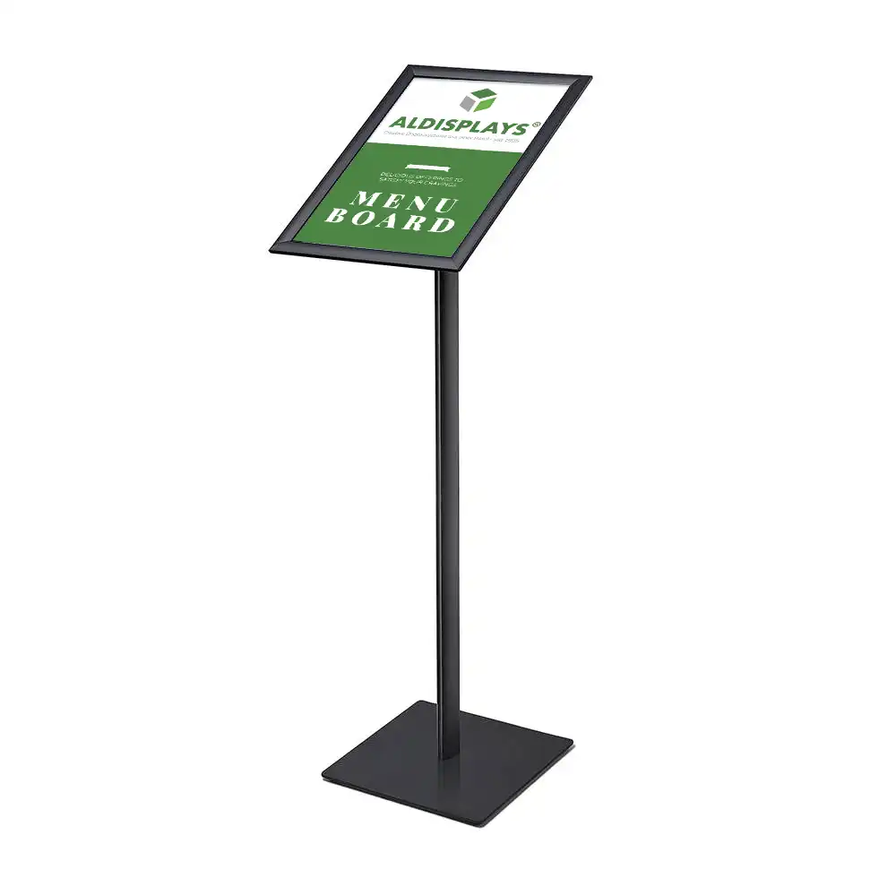 • Stilvoller Menüständer mit schwarzer Stahlplatte für professionelles Erscheinungsbild