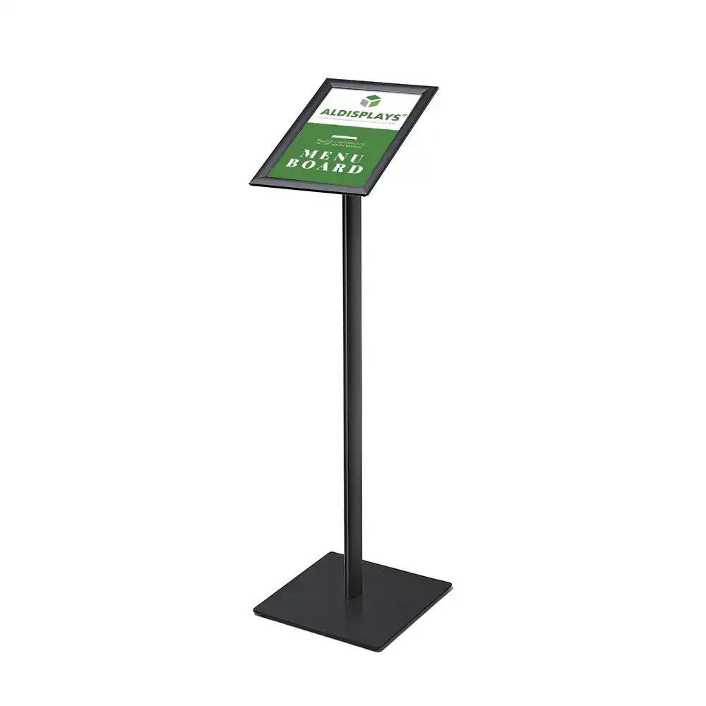 Infoständer mit Klapprahmen Schwarz - im Format DIN A4 (hoch oder quer) - Klapprahmen im 25er Profil Gehrung - Farbe: Schwarz - Einlegeformat 297x210 mm - Stabile Aluminium-Konstruktion, Fuß Metall