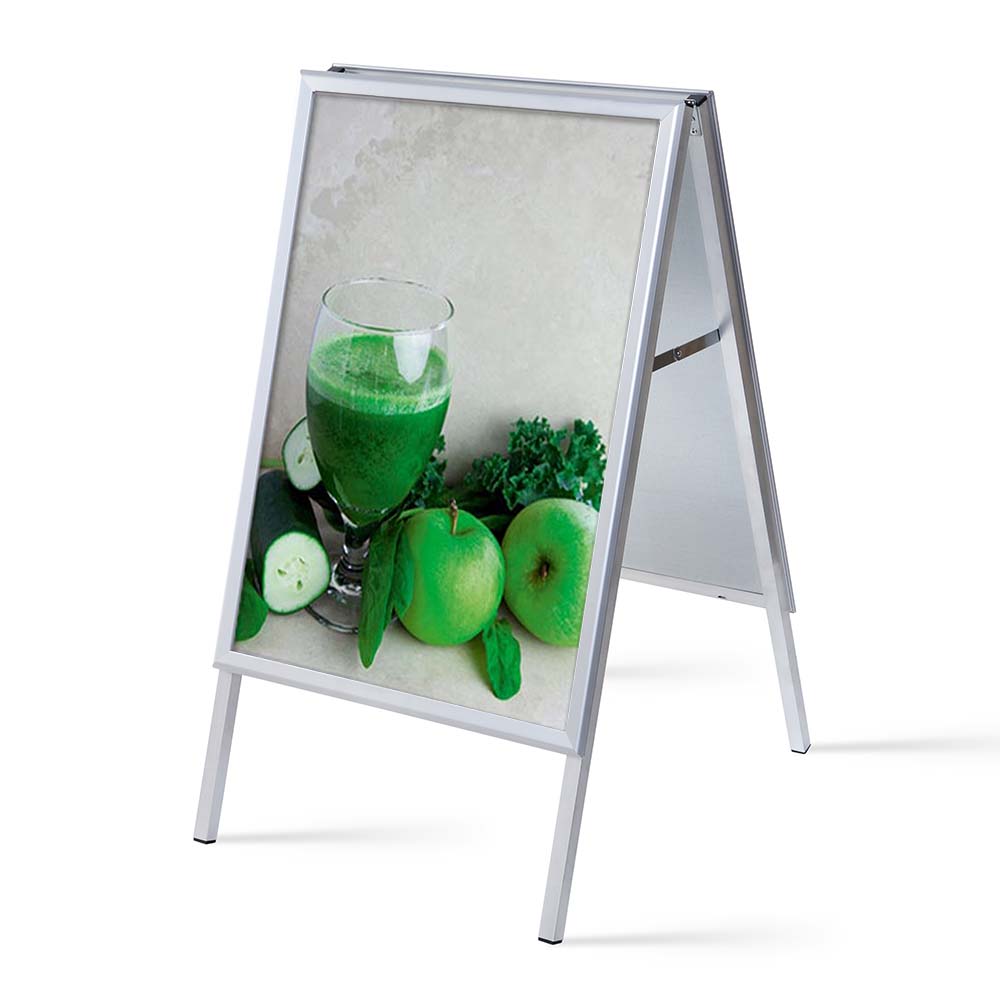 Kundenstopper INDOOR Gehrung - Einlegeformat: DIN A1 (594x841 mm) - Profil: 25mm Gehrung - Oberprofile: silber-eloxiert (EV1) - Rückwand aus schlagfestem Kunststoff - Posterschutzfolie: Antireflex