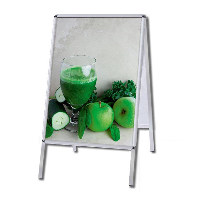 Kundenstopper INDOOR Gehrung - Einlegeformat: DIN A2 (420x594 mm) - Profil: 25mm Gehrung - Oberprofile: silber-eloxiert (EV1) - Rückwand aus schlagfestem Kunststoff - Posterschutzfolie: Antireflex