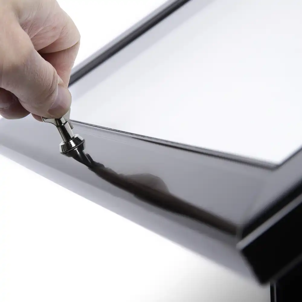 Die schlanke Aluminiumstange verleiht dem Menüständer eine moderne Ästhetik, während die massive Stahlplatte mit rutschfesten Gummifüßen für einen sicheren Stand sorgt. Ihre Inhalte im abschließbaren Schaukasten sind optimal geschützt, und die magnetische Rückwand ermöglicht ein schnelles Austauschen von Aushängen im Format 2 x A4 – ganz ohne Werkzeug.
