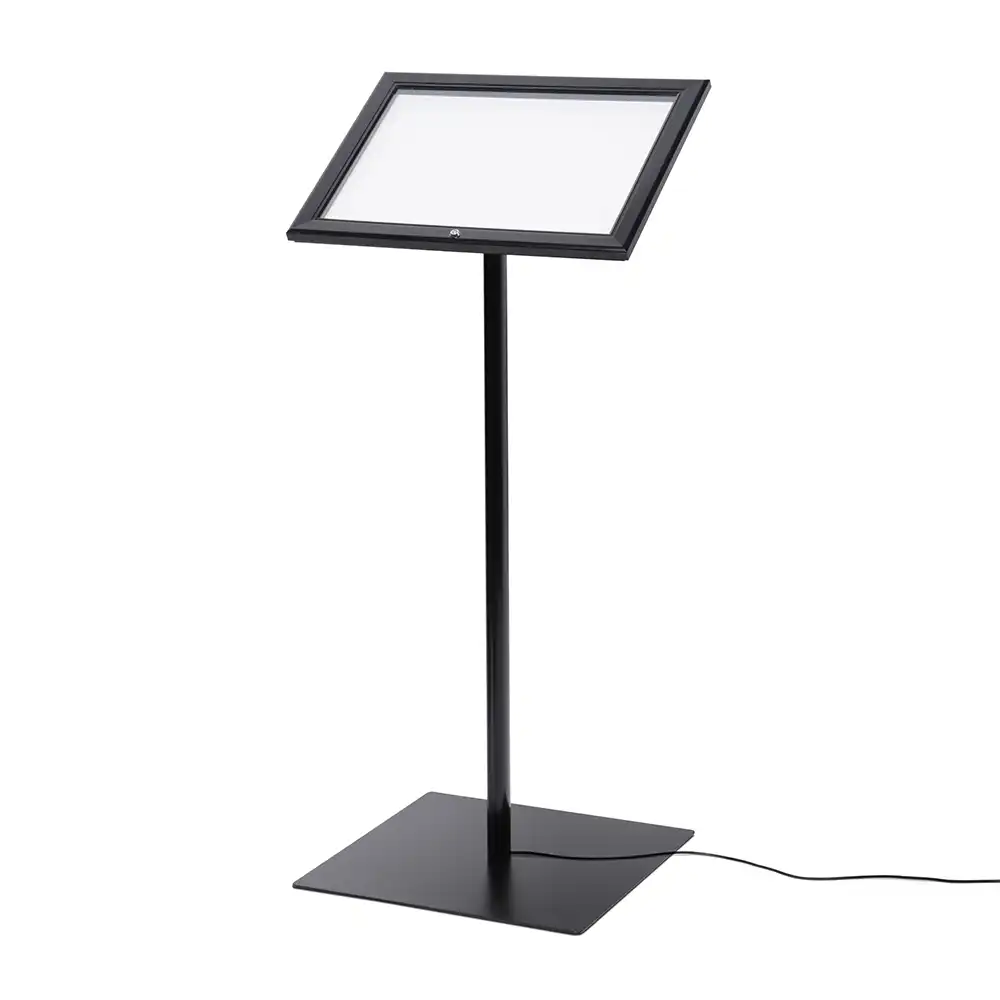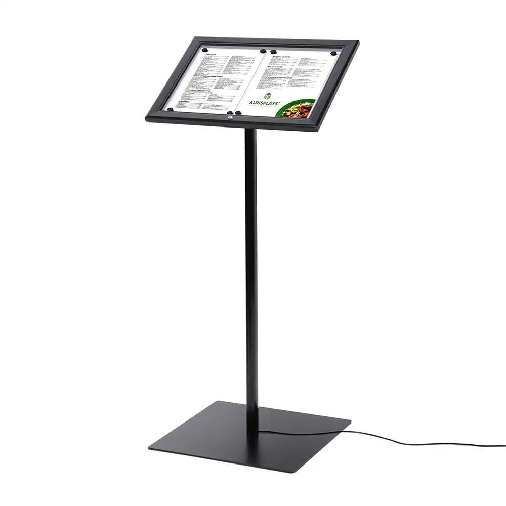Präsentieren Sie Ihre Informationen, Speisekarten oder Angebote auf professionelle Weise – mit dem abschließbaren Infoständer LED in elegantem Schwarz von ALDISPLAYS.de . Dieses hochwertige Display vereint ansprechendes Design, Stabilität und Sicherheit in einem System – ideal für Gastronomie, Hotellerie, Empfangsbereiche, Ausstellungen oder Verkaufsräume.