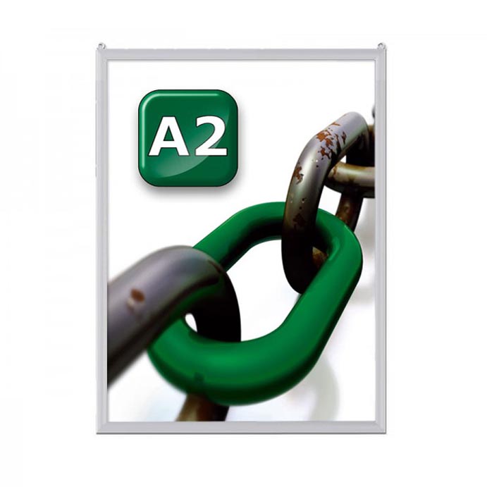 Slide-In Einschubrahmen - Einlegeformat: DIN A2 (420x594 mm) - Profil: 24 mm - silber-eloxiert - Plakateinschub an einer kurzen Seite - 2 Ösen zur Deckenabhängung an einer kurzen Seite - inkl. 2x Antireflexschutzfolie und Trennplatte